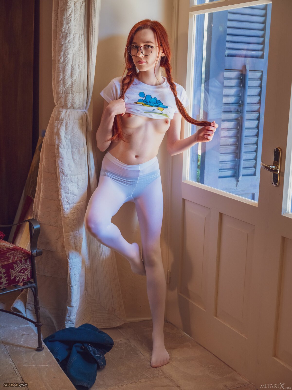 Описание: Игриво расстегивая перед камерой короткую юбочку и медленно стягивая с себя белые колготки, развратная рыжая заучка в очках постепенно разделась до гола. Выставив на всеобщее обозрение свои маленькие титьки и крепкую упругую попочку, худая девица возбуждающе извивается в кресле в разных позах и нежно теребит пальчиками чувствительный розовый клитор и нежные половые губки.