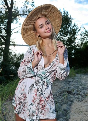 Описание: Игриво позируя на фоне природы в шляпке и возбуждающе снимая с себя короткое летнее платье, симпатичная молодая девушка без сомнений оголила свои маленькие титьки и, плавно опустившись на горячий песок, в разных откровенных позах принялась крупным планом выпячивать красивую упругую попочку с бритой нежной пиздёнкой.