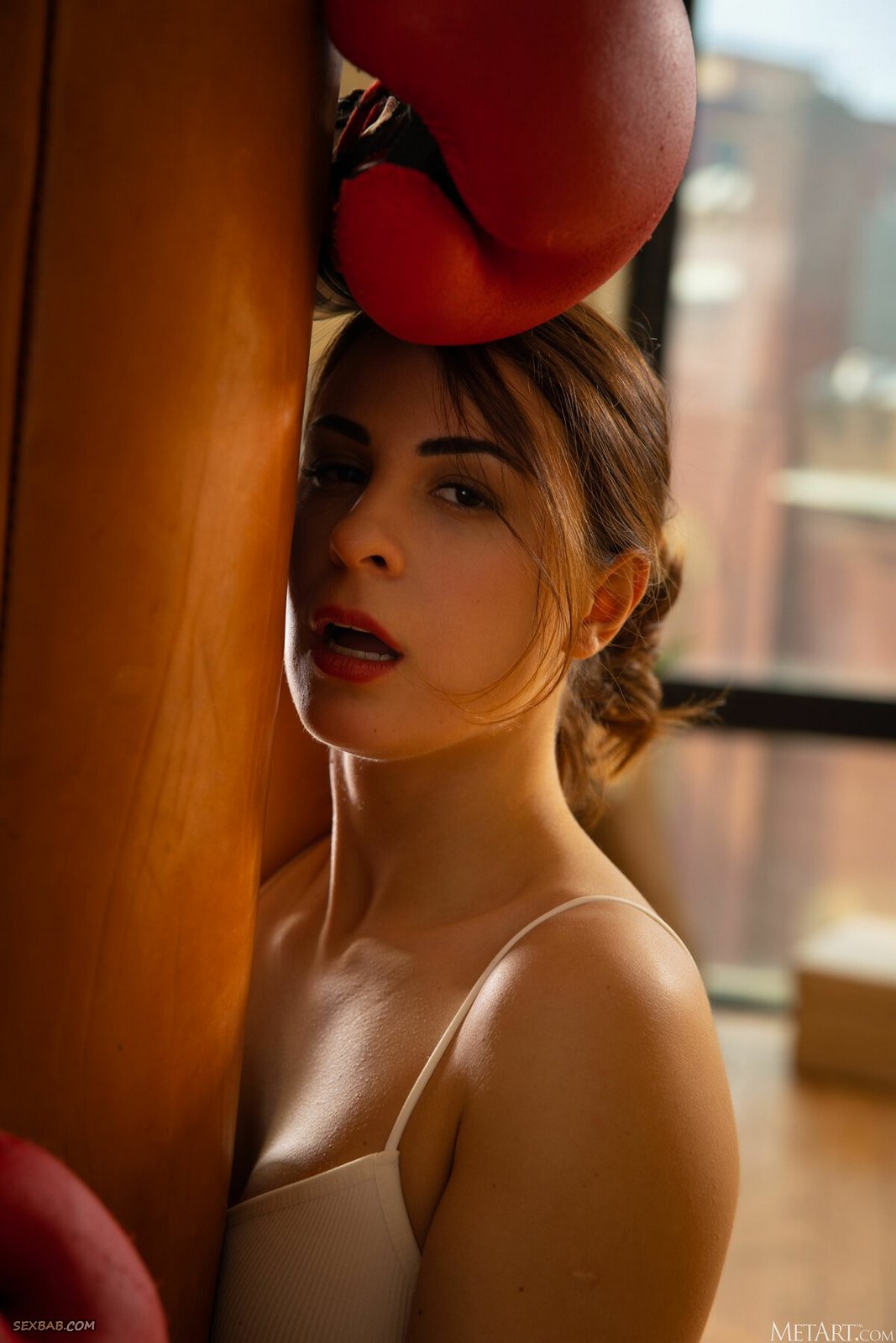 Описание: Закончив свою тренировку с боксерской грушей, уставшая потная спортсменка решила передохнуть и тут же разделась до гола, дав остынуть своему разгоряченному телу. Сексуальная баба с голыми упругими сиськами развратно позирует в спортивном зале, открыто выпячивая и подставляя как можно ближе свою бритую пизду с волосатым лобком.