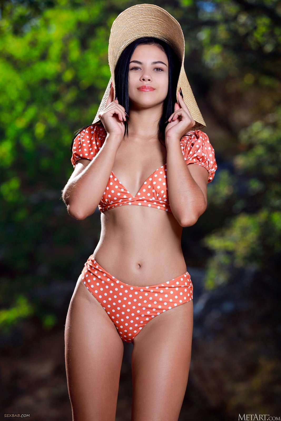 Описание: Кокетливо играясь перед камерой со своей большой шляпой, симпатичная молодая брюнетка в красивом купальнике бесстыже раздевается до гола и позирует на природе. Загорелая стройняшка с сочными упругими титьками ложится на большой горячий камень и развратно раздвигает длинные ноги, похотливо подставляя к камере свою бритую жадную пизду.
