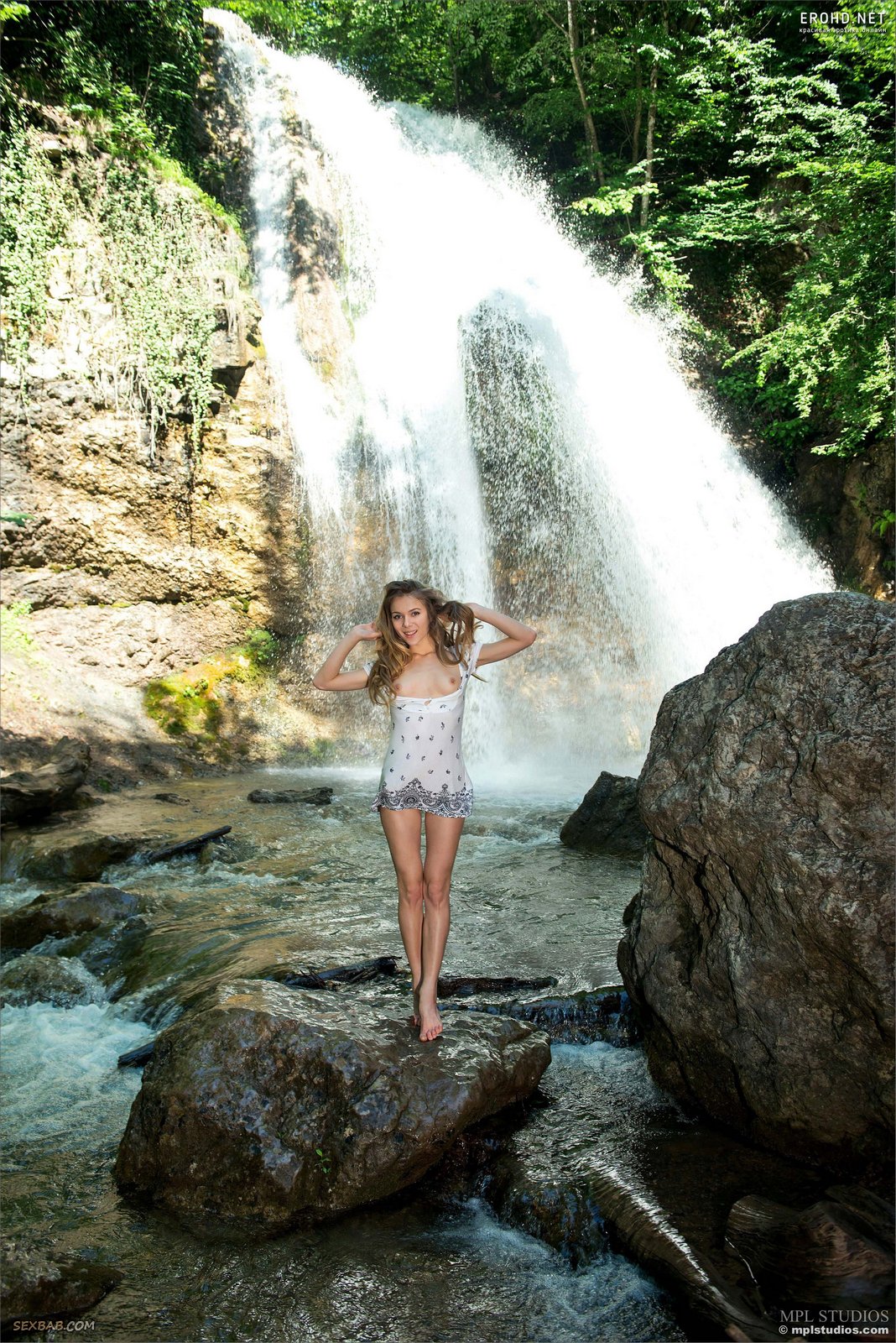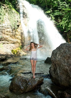 Описание: Красиво позируя на фоне бурного водопада, стройная девица в коротком платье без трусиков игриво оголила перед камерой свои маленькие аккуратные титечки и широко раздвинула ножки, раскрывая потрясающий вид на свою бритую сладенькую письку и аппетитную упругую попку.