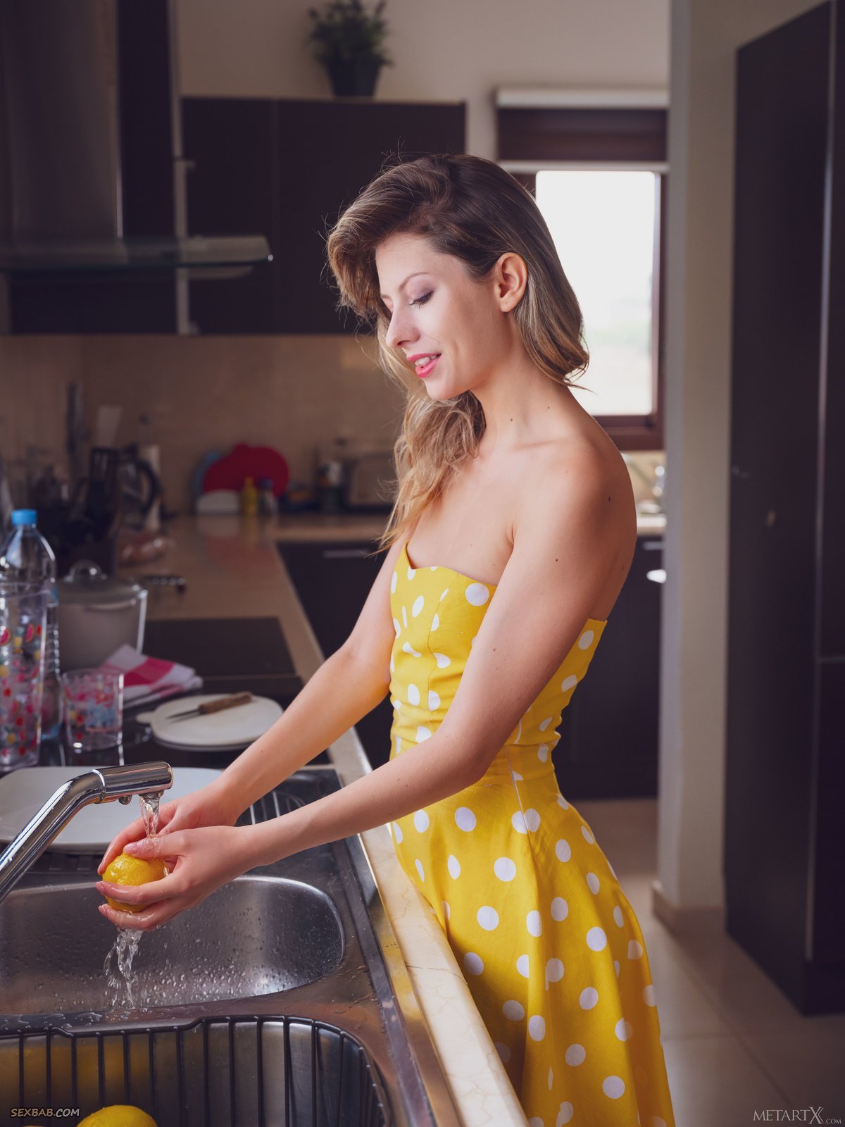 Описание: Пока никого нет дома, молодая игривая домохозяйка соблазнительно сняла с себя яркое желтое платье с трусами и быстро разделась до гола прямо перед камерой. Голая девушка с аккуратными упругими титьками вовсю хозяйничает на большой кухне и бесстыже задирает свои стройные ножки, открывая возбуждающие виды на свою подтянутую попку и гладкую розовую киску.