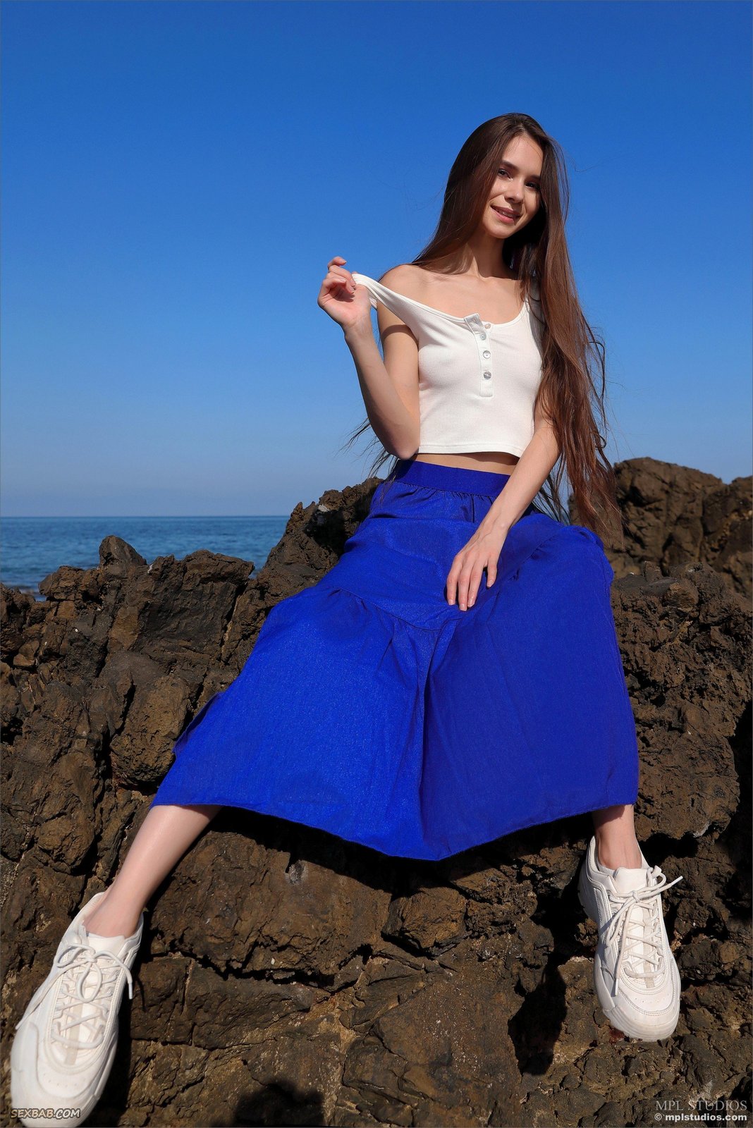 Описание: Соблазнительно задирая перед камерой длинную юбку и майку, худенькая девушка бесстыже показала все свои голые прелести на пляже. Постепенно раздевшись до гола, молодая брюнетка с миниатюрными упругими титьками расслабленно лежит на голых скалах и, широко раздвинув ножки, демонстрирует крупным планом бритую розовую киску.