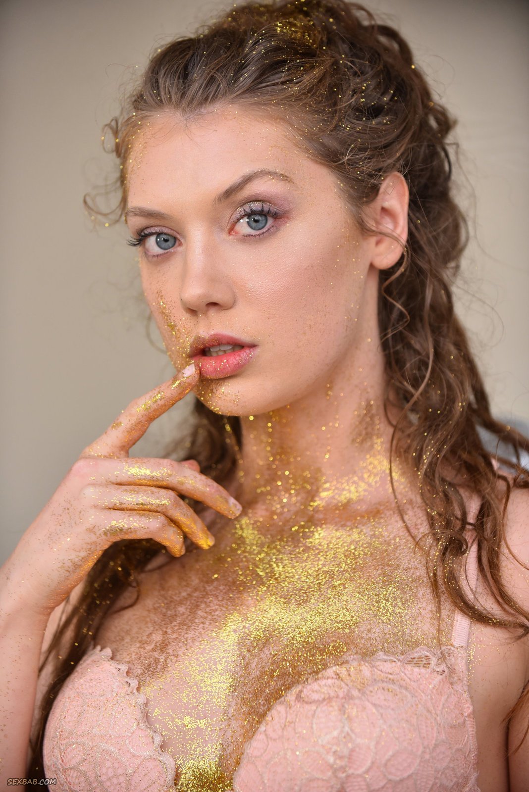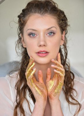 Описание: Обаятельная эротическая модель и порно актриса Елена Кошка позирует перед камерой измазав руки золотыми блёстками, а вскоре скидывает с себя халатик и трусики с лифчиком, после чего устроившись в кресле широко раздвигает ноги. Продолжая соблазнять нас откровенными кадрами, сексуальная девушка с маленькой грудью моментально принимается нежно ласкать бритую письку пальцами, при этом демонстрируя анальную пробку в тугой попке.