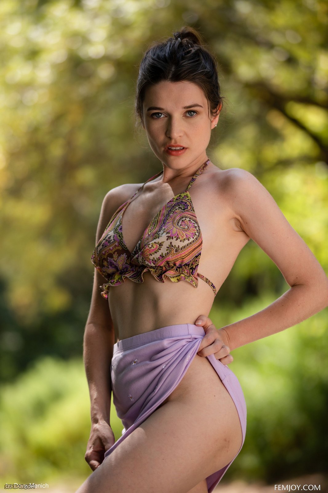 Описание: Страстно извиваясь перед камерой на фоне природы и постепенно стягивая с себя одежду, сексуальная тётка с голыми упругими сиськами кокетливо приподняла свою короткую юбку без трусов возбуждающе показала нам свой волосатый темный лобок и бритую маленькую пиздёнку между ног.