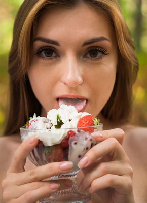 Описание: Страстно сорвав с себя всю одежду, развратная сексуальная телка вовсю развлекается в лесу, обустроив себе уютное местечко. Возбужденная девица с маленькими сиськами возбуждающе ест клубнику со сливками, а затем раздвигает свои стройные ножки и начинает ласкать свою бритую сочную письку пальчиками.