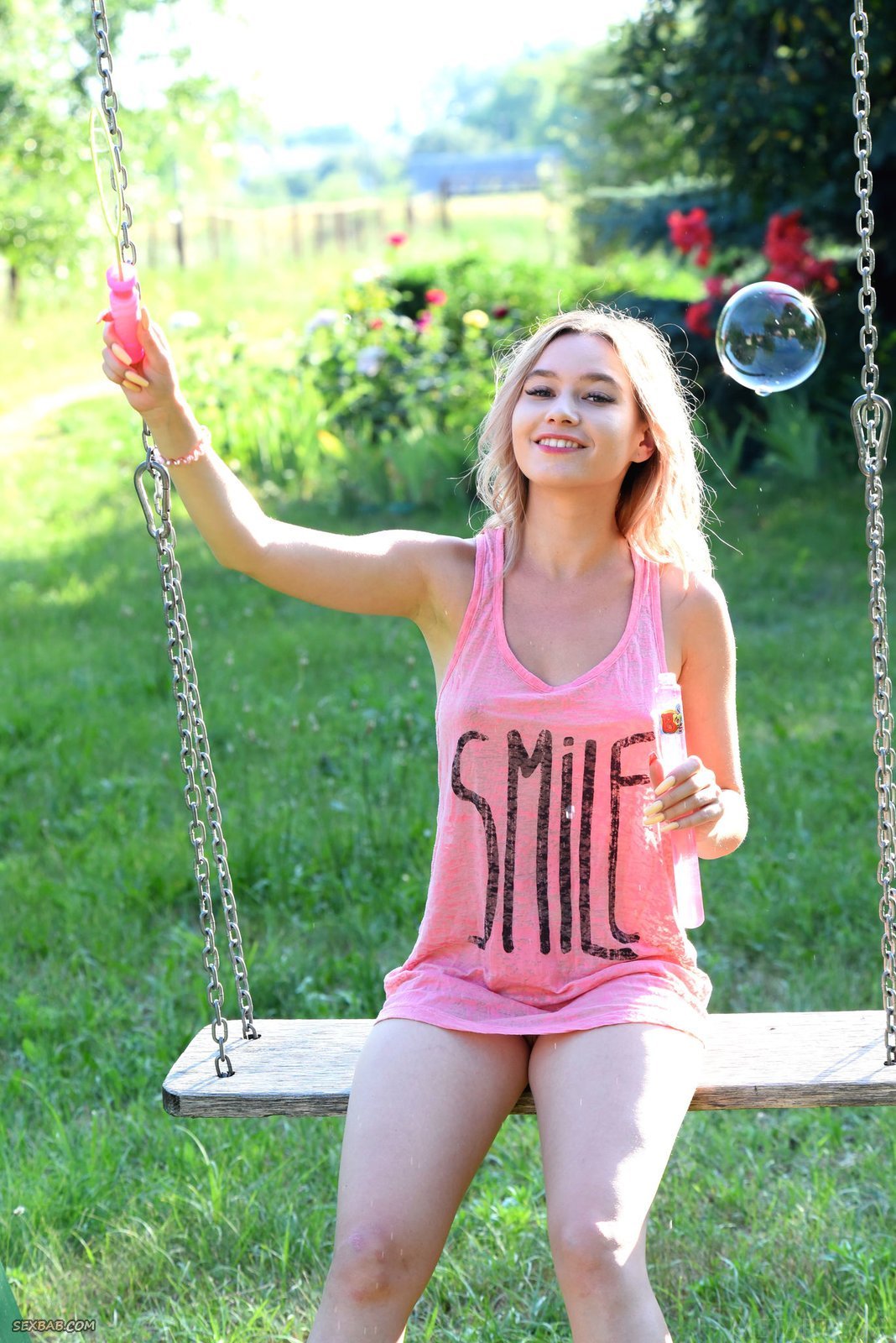Описание: Очаровательная нежная блондинка в розовой майке без трусиков, устроившись на качели в парке, завораживающе позирует и улыбается нам. Испытывая сильное удовольствие от происходящего с ней, стройная девушка в какой-то момент скинула с себя все лишнее и засветила упругие сиськи с вожделенной писькой.