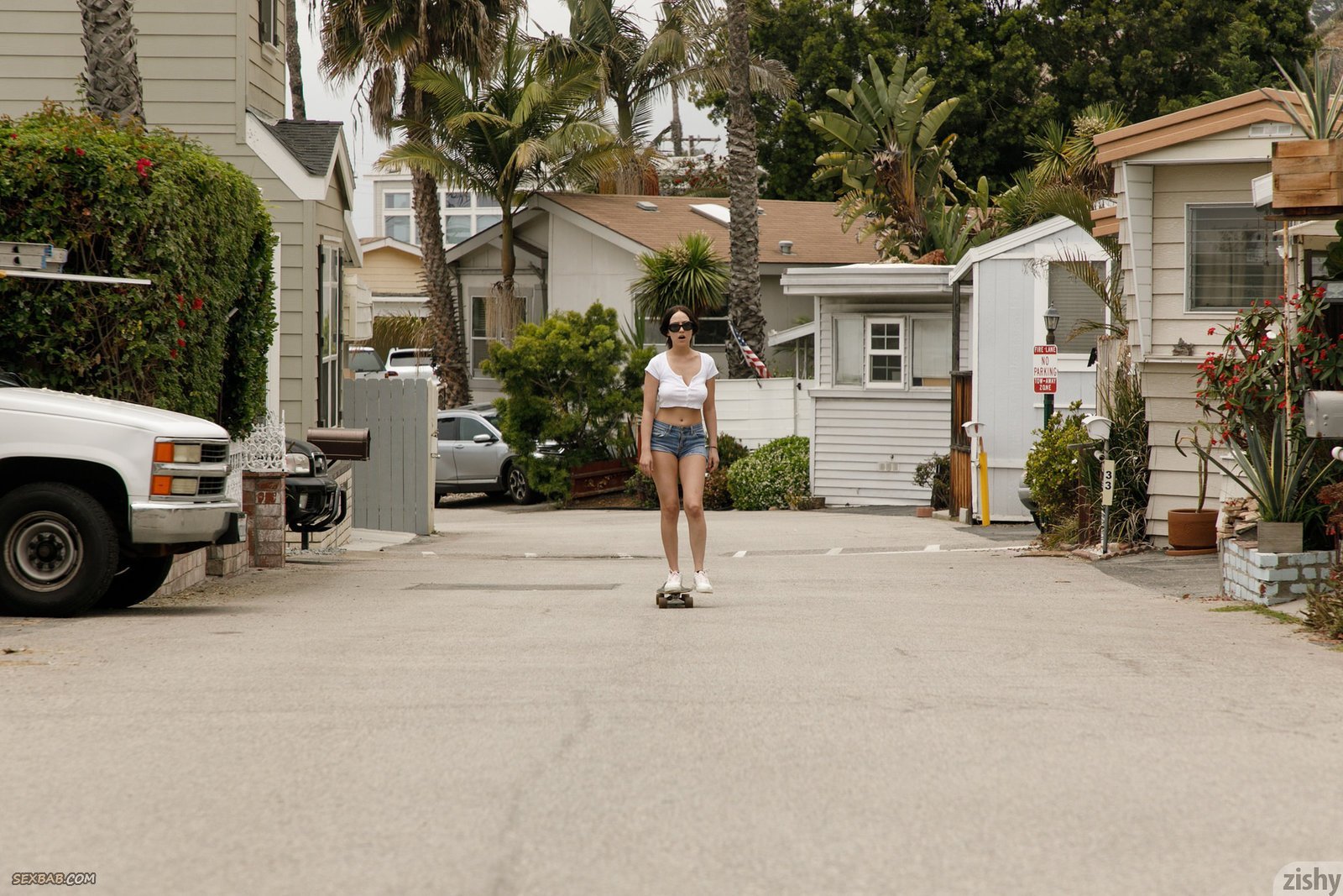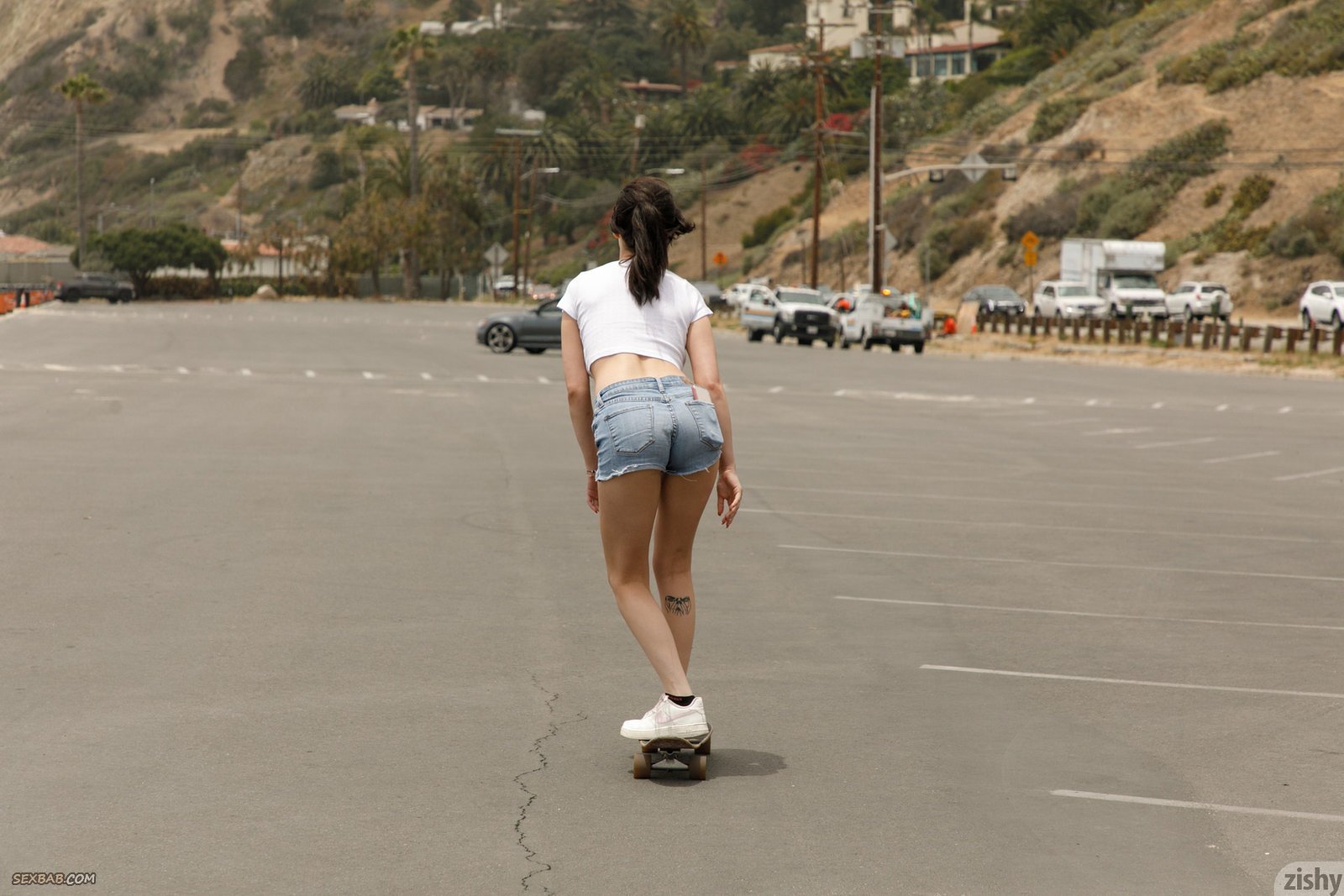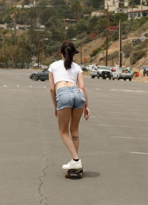 Описание: Развязная сучка в коротких джинсовых шортах и футболке гуляет на улице и катается на скейте, при этом мило улыбаясь и строя глазки на снимающую её камеру. В будущем сексуальная милашка немного засвечивает натуральные сиськи и переодевшись в купальник продолжает показывать себя на пляже.