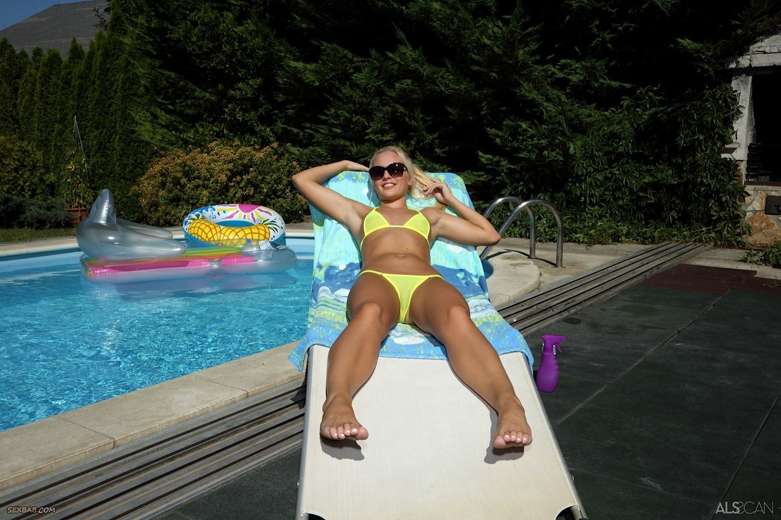 Описание: Худая блондинка в солнцезащитных очках, искупавшись в бассейне, выбралась из воды и скинув купальник намазалась маслом на шезлонге, параллельно стараясь откровенно показывать сексуальное тело. Таким образом молодая девушка с маленькой грудью больше всего засвечивала бритую письку с гладким лобком.