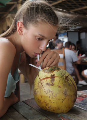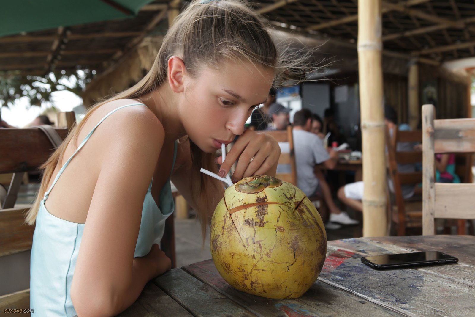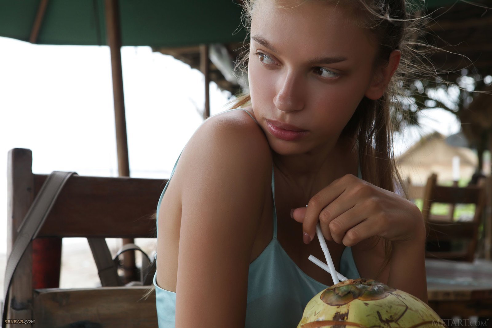 Описание: Освежившись в баре свежими коктейлями, симпатичная девушка сняла купальник на пляже и перед камерой показала большие и очень красивые сиськи с аккуратными сосками. После этого красавица позволила взглянуть на бритый лобок с манящей киской, скромно тушуясь в неуверенных позах.