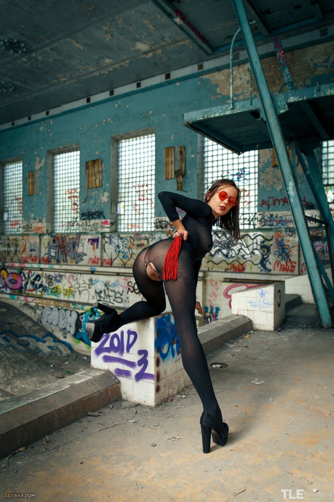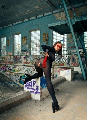 Описание: Нарядившись в возбуждающий капроновый комбинезон с прорезью между ног, дерзкая и невероятно сексуальная модель в красных очках с плеткой позирует в заброшенном здании. Наслаждаясь, красотка с заклеенными сосочками на натуральных сиськах раздвигает промежность, и трогая клитор акцентирует внимание на бритой письке.