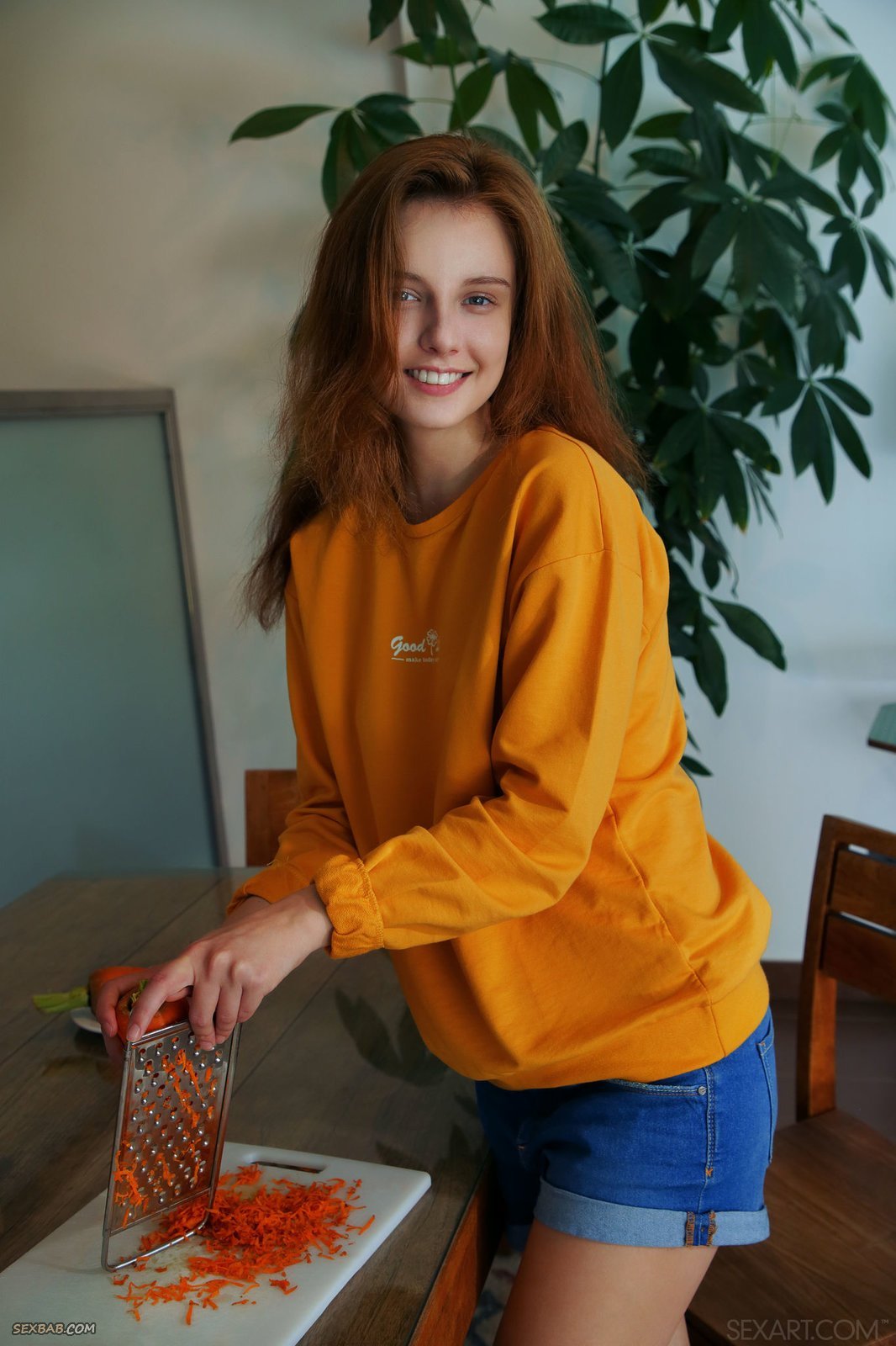 Описание: Похотливо раздевшись до гола на кухне, рыжая девица с большой морковкой в мокрой бритой писе развратно разлеглась на столе. Молоденькая похотливая девка с маленькими сиськами от наслаждения закатывает глаза, когда сильно и страстно загоняет толстый длинный овощ в свою текущую сладкую киску.