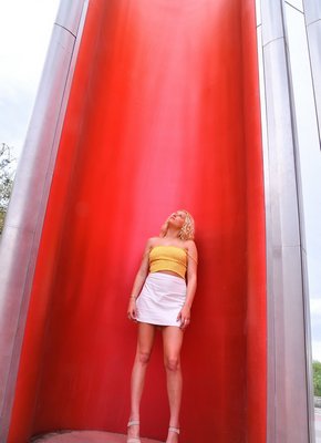 Описание: Нарядившись в красочную майку и юбку, симпатичная извращенка с милой улыбкой и вьющимися локонами волос, гуляя на улице, начинает эротично позировать и в некоторых местах демонстрировать бритую письку. В тот момент когда молоденькая девушка выставляла на показ киску рядом с кафе, она параллельно немного ласкала ее специальным вибратором, доставляя себе сильнейшее возбуждение, а так же сжимала натуральные сиськи руками.
