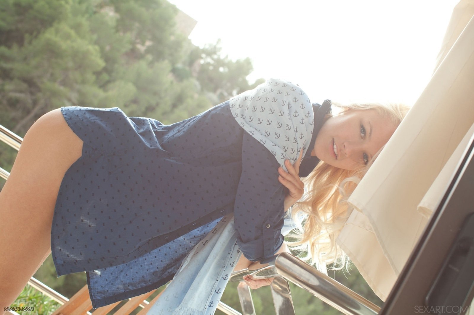 Блондинка в трусиках и рубашке на балконе