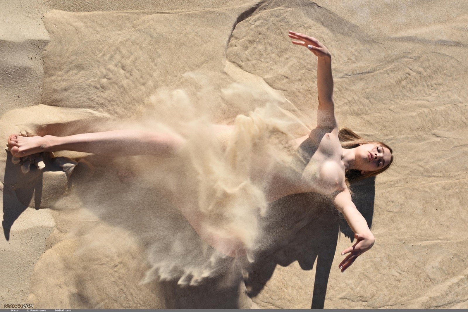 Обнаженная стройная девушка позирует в пустыне