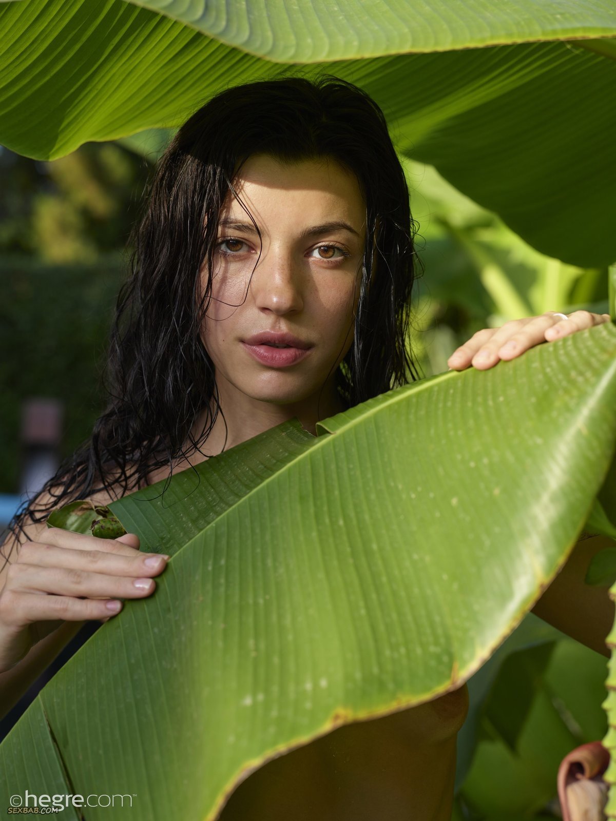 Описание: Среди яркой сочной зелени спряталась голая мокрая брюнетка у бассейна и соблазнительно позирует в свое удовольствие. Чувственная красавица словно настоящая русалка горячо выгибается всем своим влажным блестящим телом с маленькой грудью и изящными линиями стройных бедер и длинных ног.