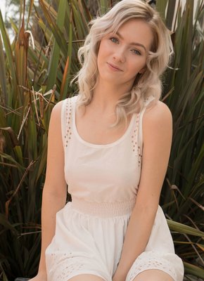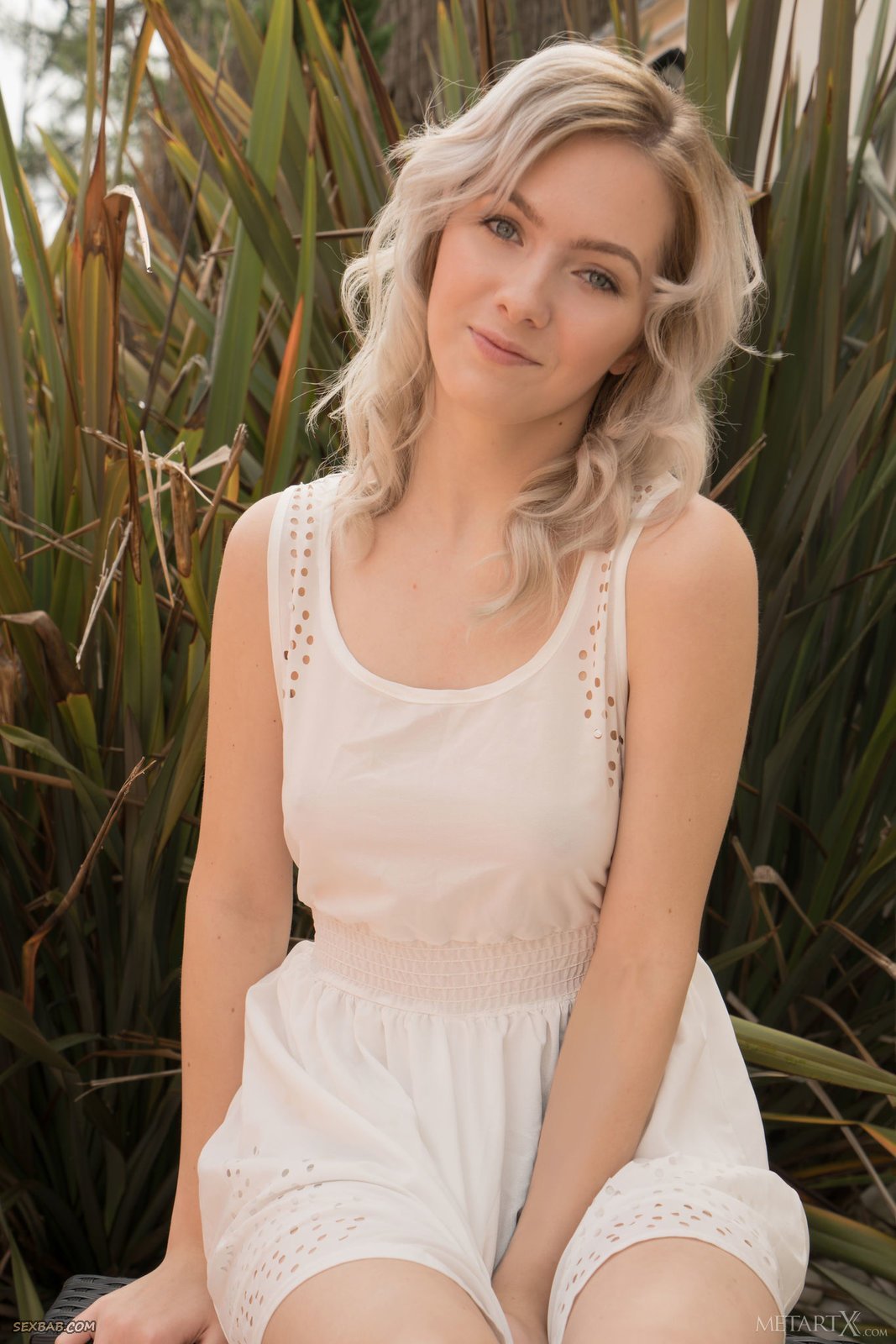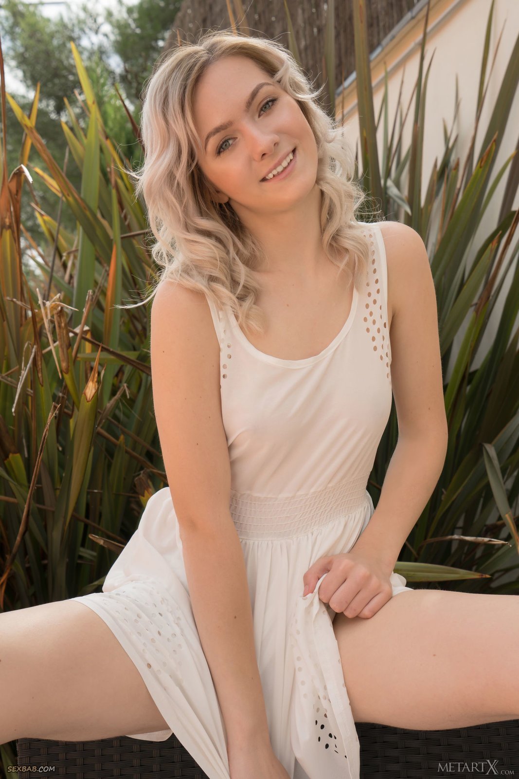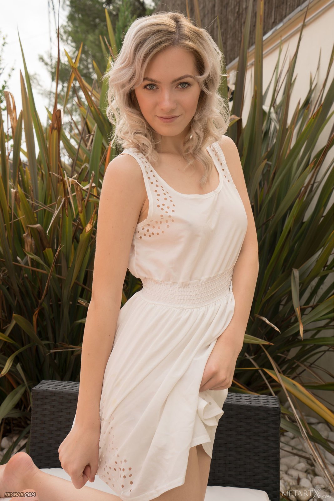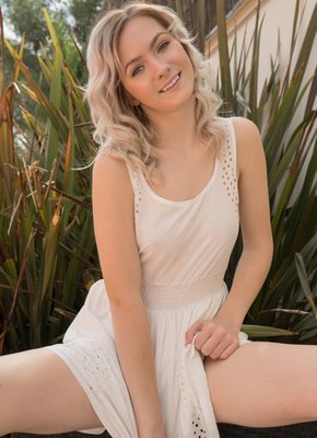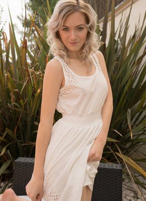 Описание: Устроившись на кресле в саду загородного дома, нежная светловолосая девушка с милой внешностью эротично позируя медленно снимает белое платье. Так как под ним больше ничего оказалось, сексуальная стройняшка подробно засвечивает бритую возбуждающую письку и маленькие сиськи.