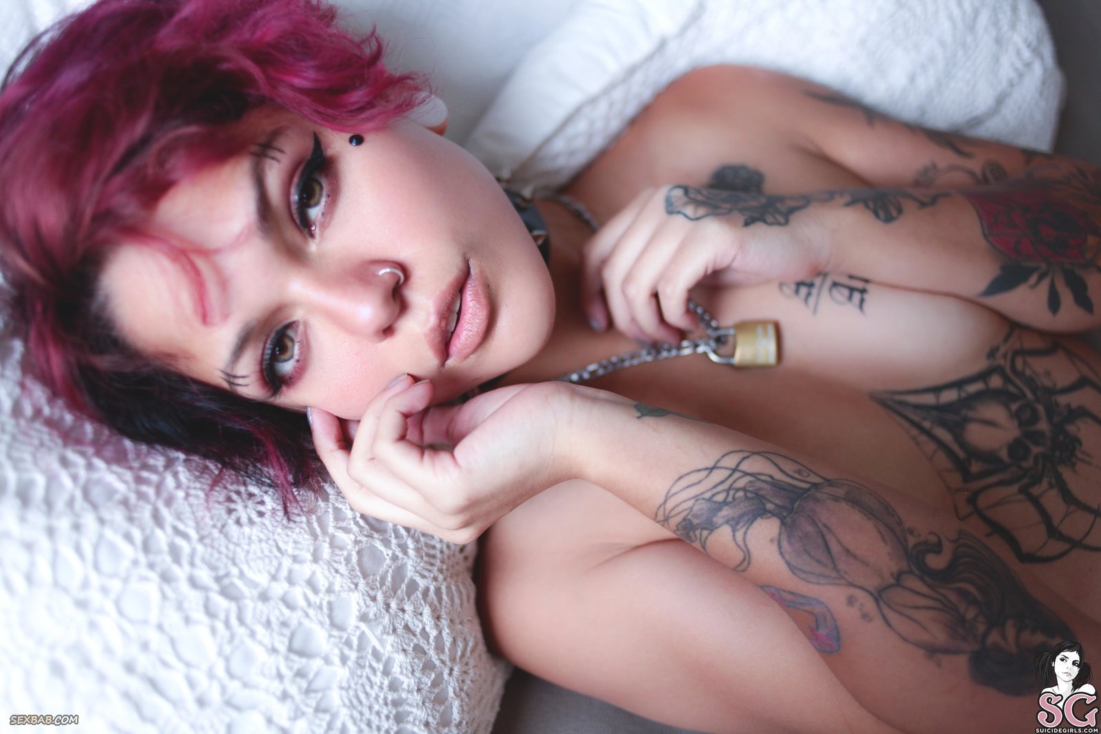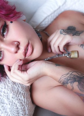 Описание: Оставшись дома, молодая неформалка лежит в постели и снимает с себя кружевное белье, обнажая свое худое тело, полностью покрытое татуировками. Голая девушка стеснительно прикрывает свои маленькие грудки руками и призывно смотрит прямо в камеру своими красивыми глазами.