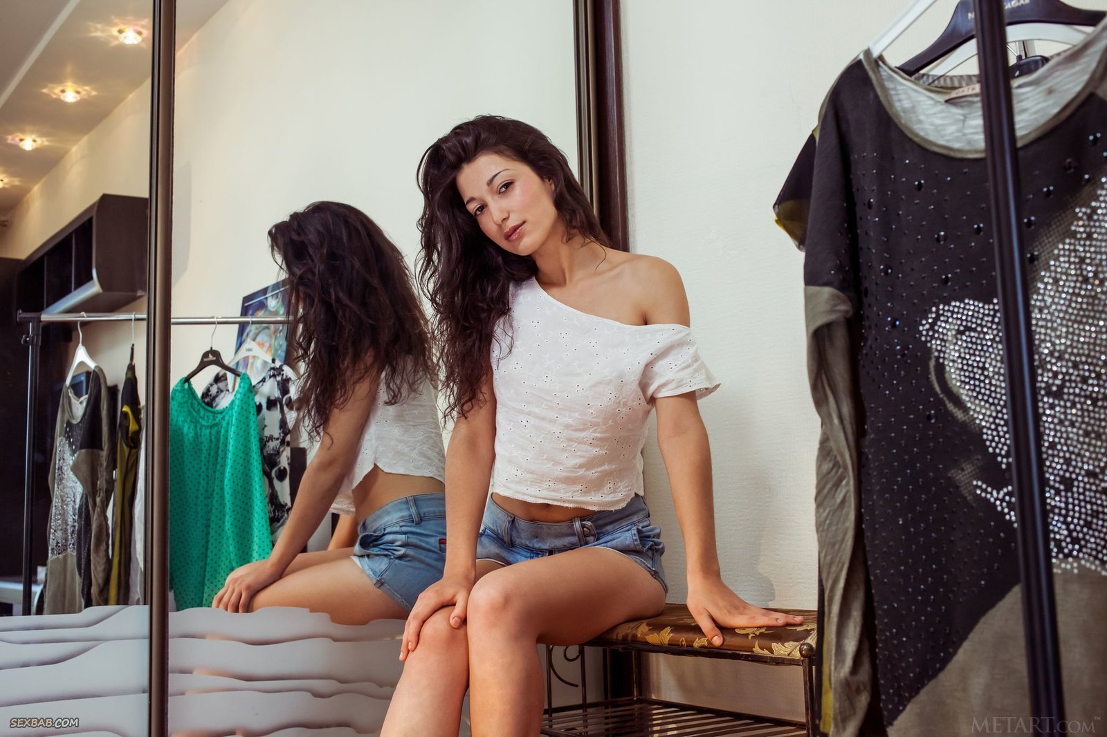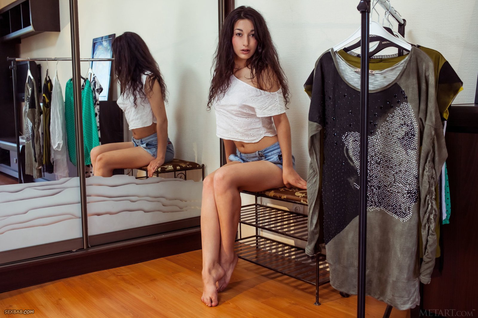 Описание: Расположившись дома рядом со шкафом и зеркалом, стройная девушка с возбужденными сосками на натуральной груди в трусиках и белой майке начинает позировать и медленно раздевается перед нами снимая все лишнее, стараясь демонстрировать сексуальное тело с наиболее возбуждающих ракурсов. А оказавшись голой, коасотка грациозно подняла ножки и засветила свою гладко выбритую письку.