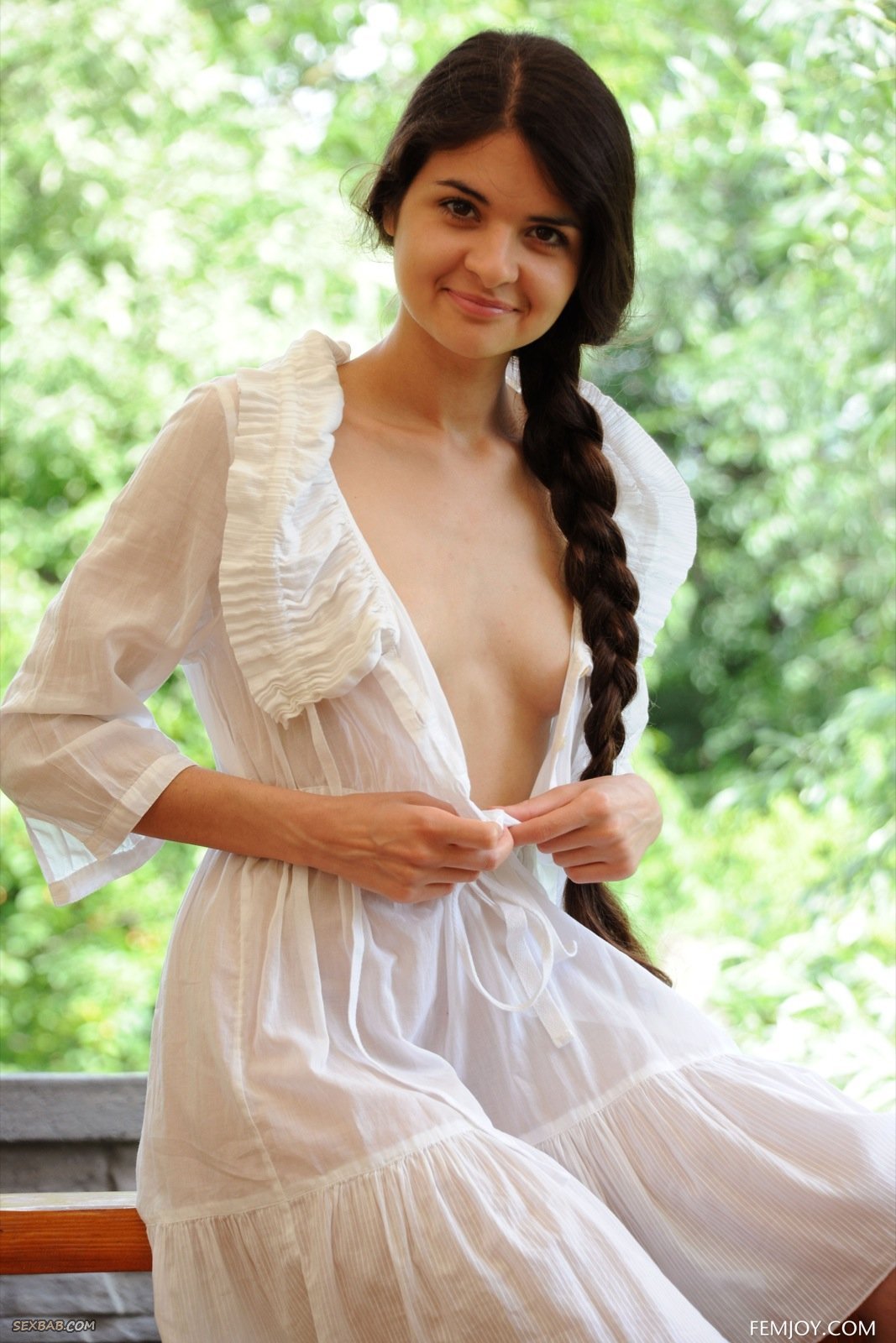Описание: Привлекательная молодая девка с миниатюрными сиськами, скинув полупрозрачное бело платье, эротично позирует рядом с загородным домом. Улыбаясь и теребя косичку, стройная красотка засвечивает лобок с волосиками и бритую письку, а повернувшись спиной упругую попку.