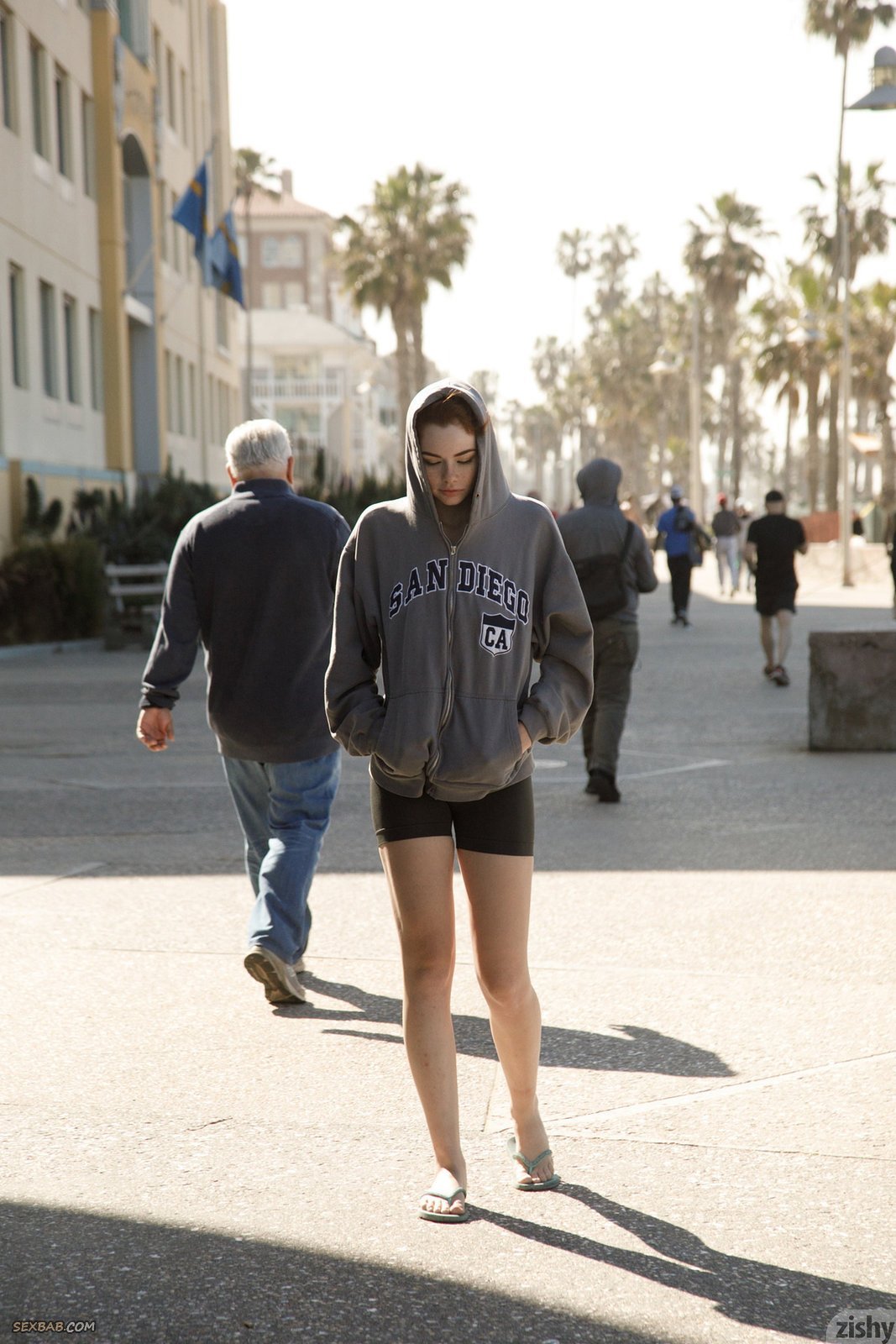 Описание: Оказавшись на пляже, достаточно сексуальная рыженькая девушка в веснушках на лице и руках старается скинуть по максимуму вещей и попозировать в разных позициях. Чаще всего молоденькая крошка располагается на песке, немного оттопыривая топик и засвечивая сочную натуральную грудь, при этом раздвигая промежность в шортиках.
