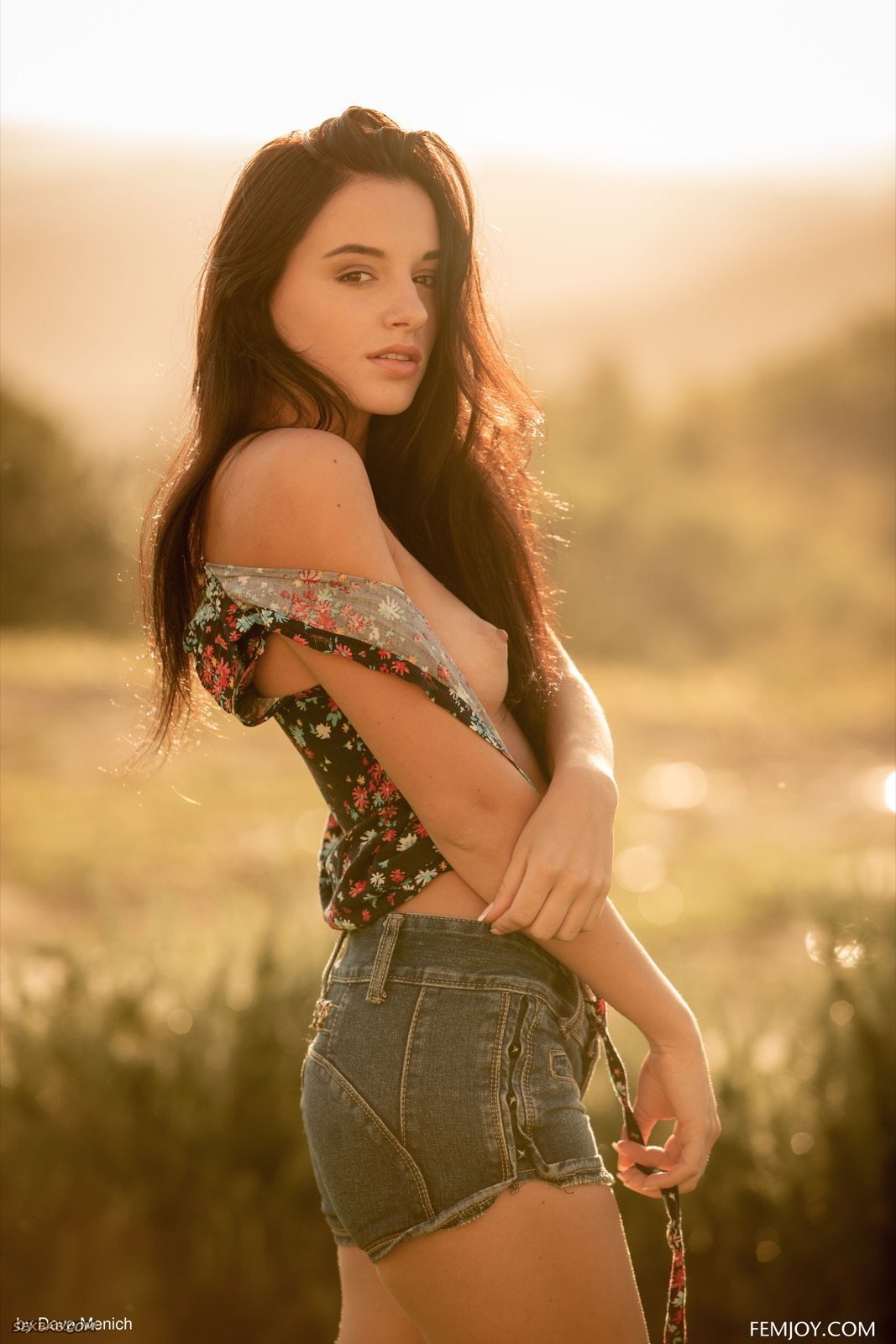 Описание: Выбравшись на природу, молодая шатенка в коротких шортиках эротично позирует и медленно раздевается на закате. Строя глазки и грациозно двигаясь, сексуальная девушка с маленькой грудью подробно продемонстрировала возбуждающую бритую письку с гладким лобком и попку, присаживаясь в процессе на траве.