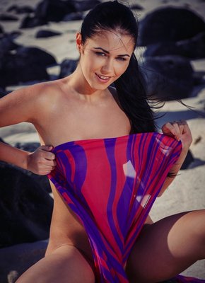 Описание: Прикрываясь парео, игривая и полностью обнаженная брюнетка нежится на пляже, присаживаясь на камень и валяясь на песке. Испытывая от своей наготы сильное возбуждение, стройная красавица с большой радостью демонстрировала маленькие сиськи и гладенькую письку с аккуратной попкой, порой поглаживая лицо руками.