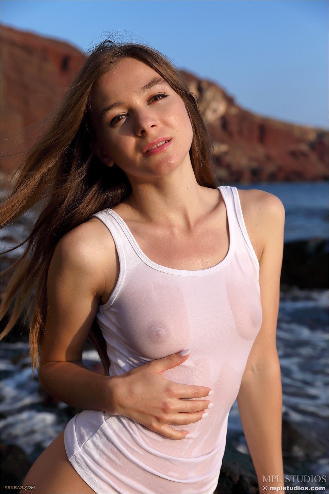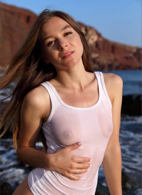 Описание: Обаятельная длинноволосая девушка в мокрой белой майке без трусиков эротично позирует у моря и поглаживая себя руками ощущает удовольствие. В процессе сексуальная стройняшка устраивается на камне и задирая остатки одежды демонстрирует маленькие сиськи, а раздвигая промежность показывает бритую письку.