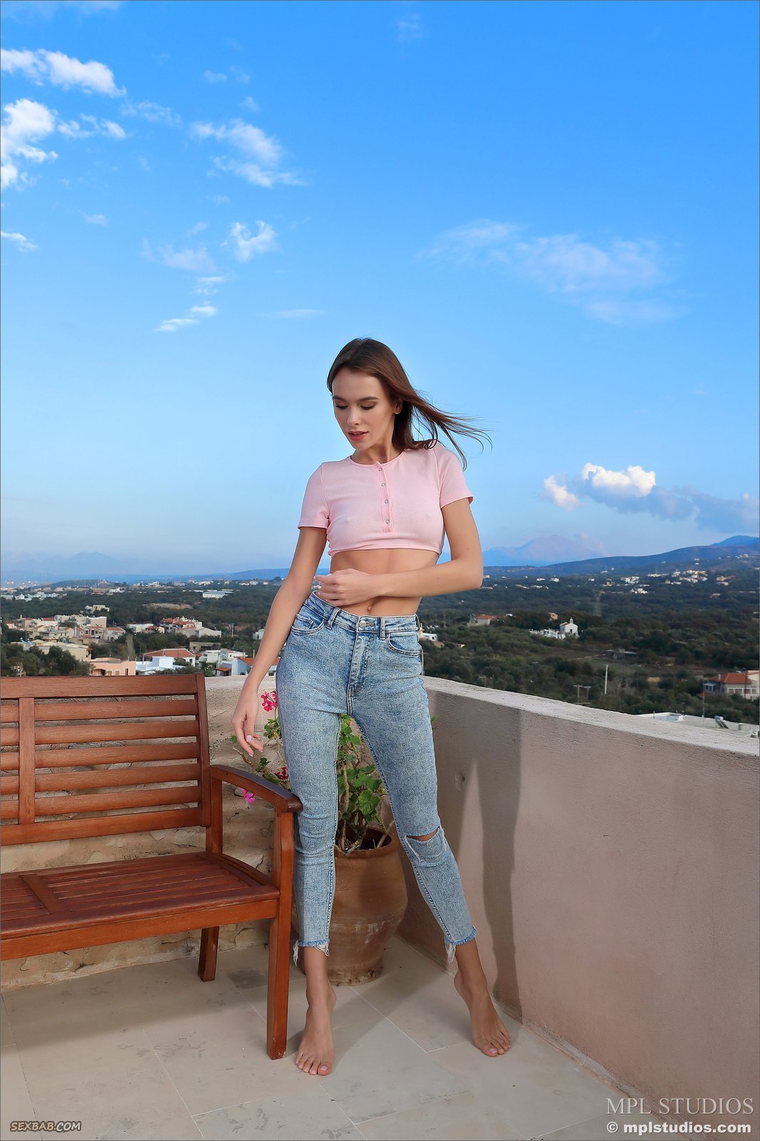Описание: Начав позировать летним днем на крыше дома, босая девица с длинными ногами в процессе строит глазки и максимально эротично раздевается. Оголившись, сексуальная стройняшка располагается на лавочке и подробно засвечивает маленькие сиськи с попочкой и гладко выбритую письку.