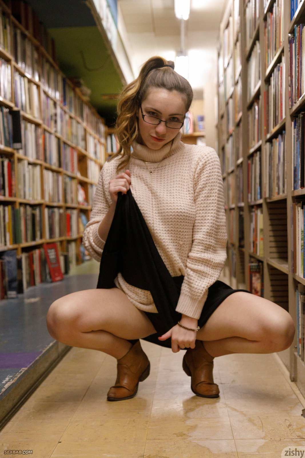 Милая девица в юбке показала попку и сиськи в библиотеке